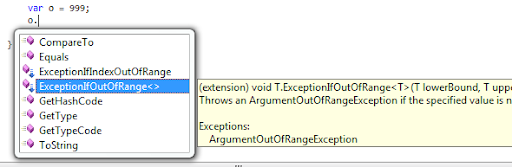 Note that in the first case the variable "o" is of the type "object", and the only applicable method is the one that checks for null. In the second case "o" is of the type "int" and now there are two applicable methods, the one that checks if arguments that implements IComparable(T) are within a specified range and the one that checks if an index (int) is within a specified range. Since int is a value type it can't be null so the ExceptionIfNull(T)-method is not applicable, this is little piece of magic is accomplished by the generic constraint "where T : class" that set on the ExceptionIfNull(T)-method.